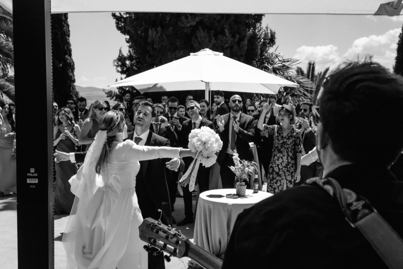 Tras los juramentos y ritos para oficializar a la pareja como matrimonio, pudimos realizar una salida espectacular con momentos mágicos como el vuelo de dron con todo el mundo saludando mientras los novios se besaban, captando en el mismo plano la ciudad de Granada desde el cielo.