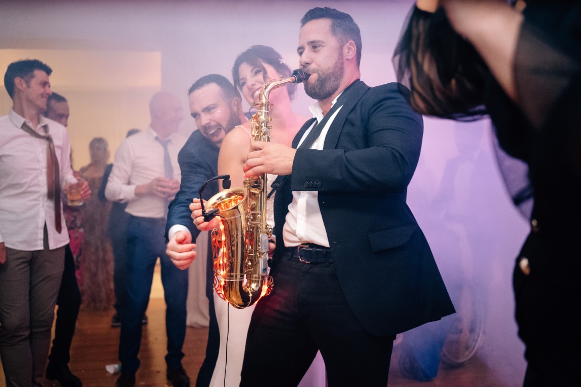 Durante la barra libre, la música en directo siguió marcando el ritmo. Hubo cánticos populares como el clásico “Hoy hemos venido a emborracharnos” o “Se casan de penalti” que animaron todavía más el ambiente.